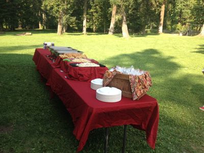 o We have a classy backyard BBQ feel, with silver chafing dishes for all hot items, bowls and baskets for all cold items. You can choose between burgundy tablecloths (BBQ sauce friendly color) or classic red and white checkered cloths. We use black for accent on buffets. We use biodegradable and compostable woodenware wrapped in a black napkin and tied with twine. See pictures of some of our recent events in our photo section.